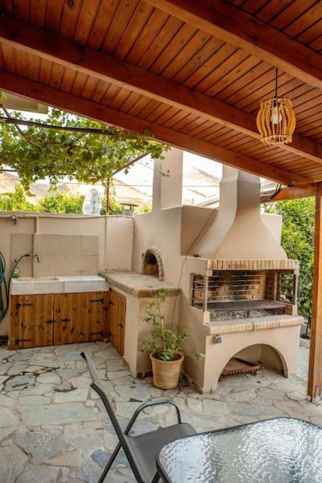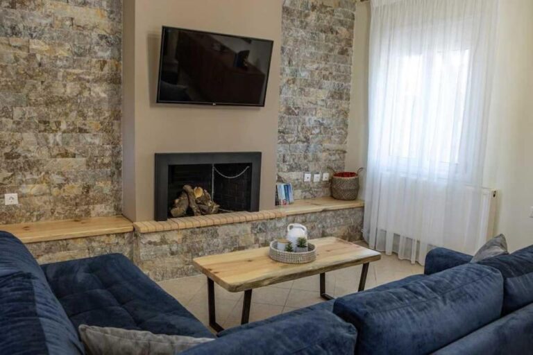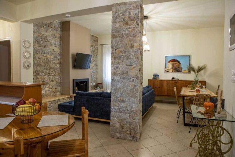The space also includes a large living room with a traditional fireplace, comfortable seating, and a TV — ideal for relaxing after a day of exploring the Cretan countryside.
